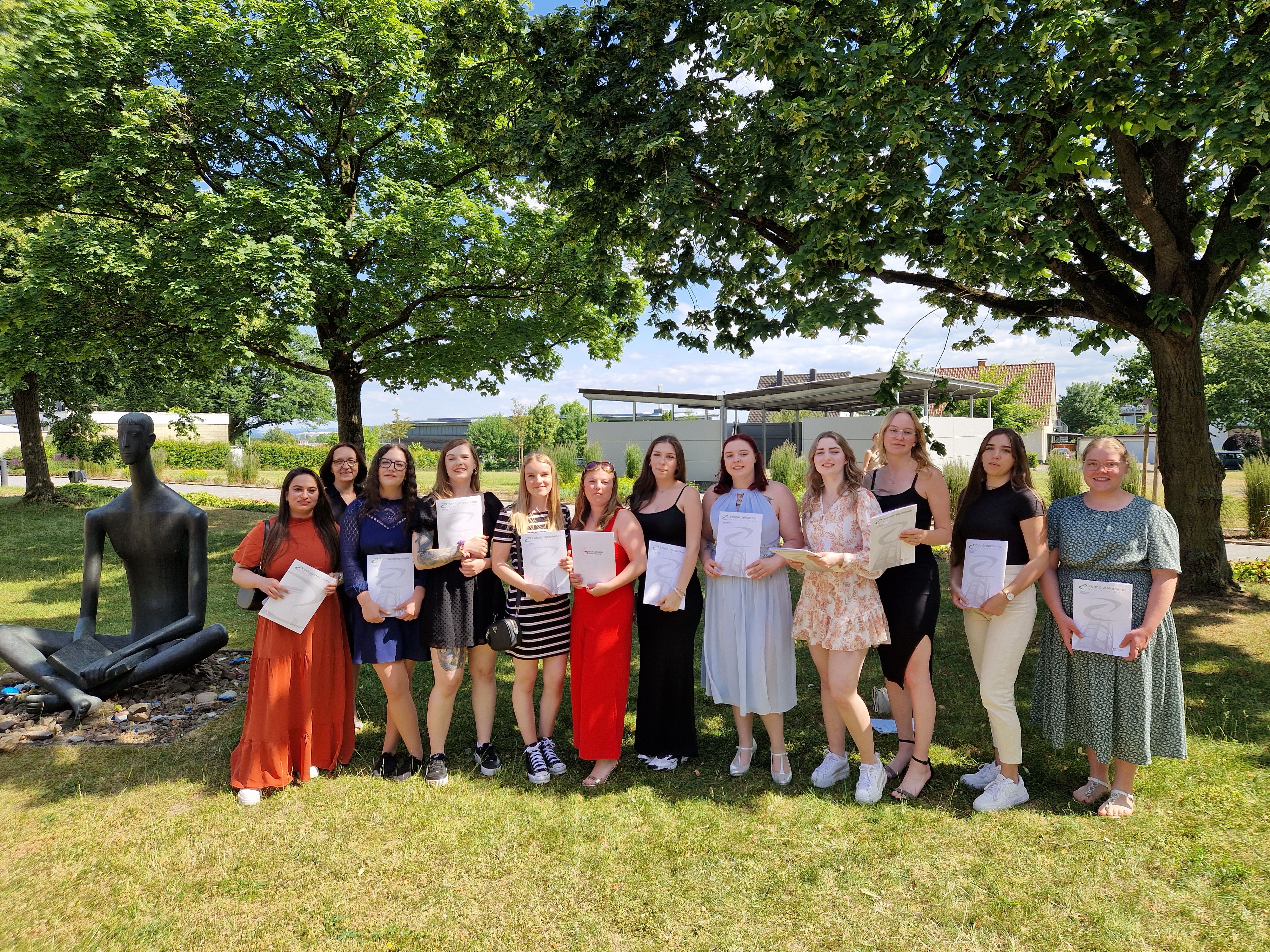 Am Mittwoch, dem 14.06.2023, wurden den insgesamt 50 erfolgreichen Absolventinnen der Ausbildungsberufe zur medizinischen (24) sowie zur zahnmedizinischen Fachangestellten (26) in feierlichem Rahmen ihre Berufsschulabschlusszeugnisse sowie die Zeugnisse der Ärzte- bzw. Zahnärztekammer verliehen.