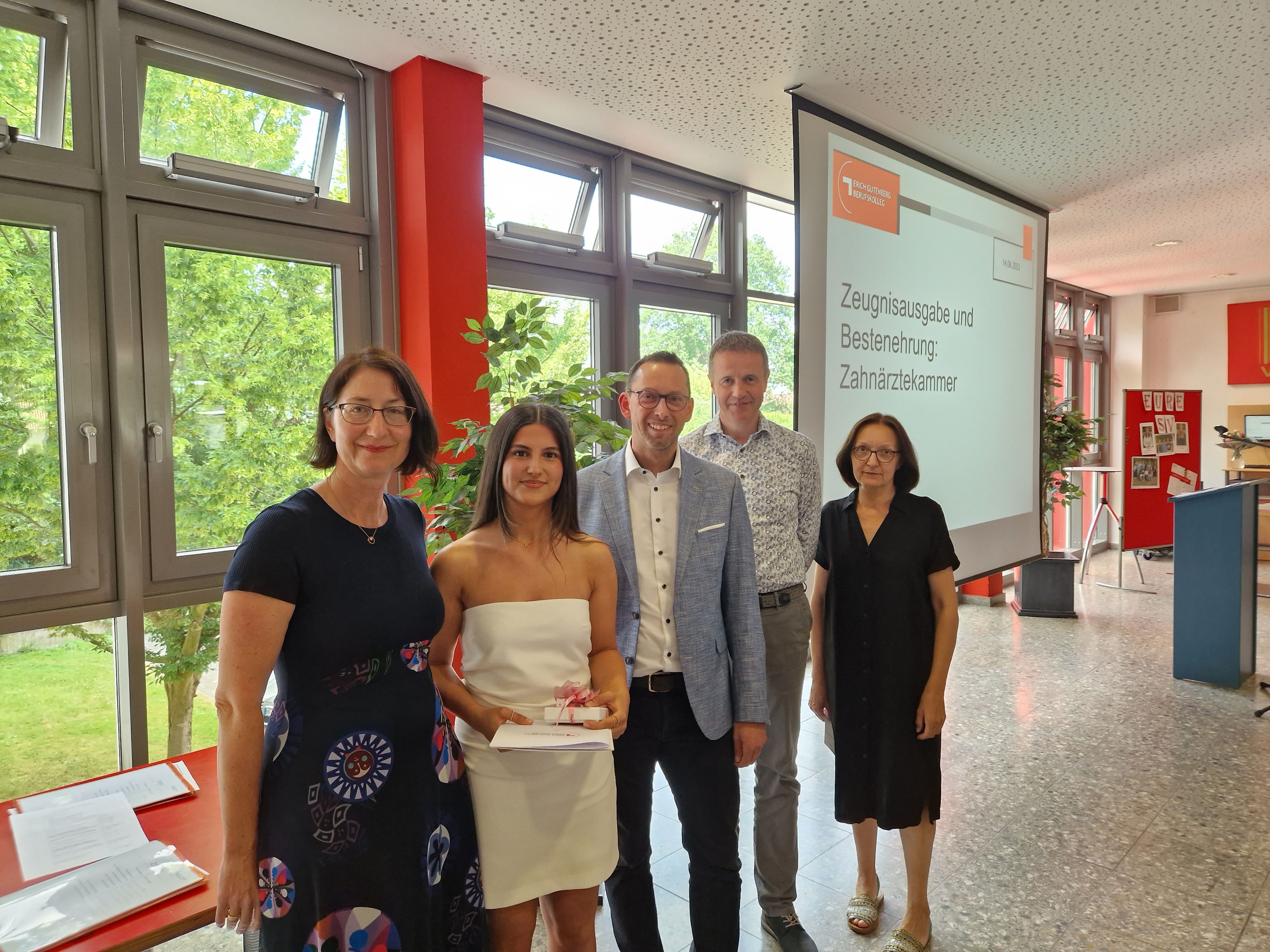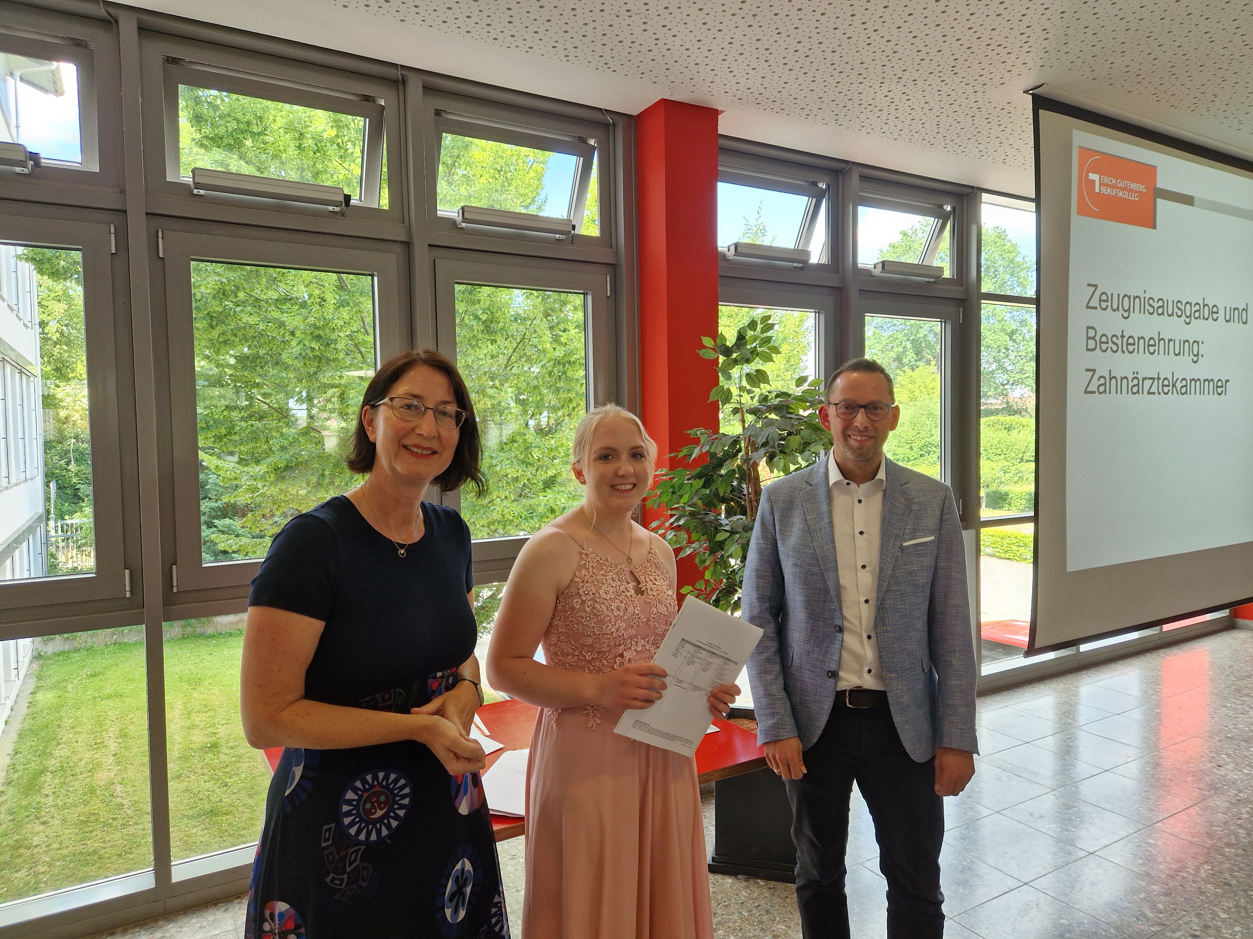 Die Klassenleitungen Dr. Ariane Lorenz (MF001), Katharina Loose (MF002) und Beate Meyer-Hartig (ZF001) sowie Barbara Holle (ZF002) übergaben ihren ehemaligen Schützlingen ihre Zeugnisse. Besondere Ehrung verdienen die jeweils Besten beider Ausbildungsberufe: Leanne Linke aus der MF002 (sowohl Berufsschulzeugnis mit 1,5 als auch Kammerprüfung mit 1,3), Irem Türkeli aus der ZF001 (Berufsschulzeugnis mit 1,1) und Cornelia Wiebe aus der ZF001 (Kammerprüfung mit 1,4).