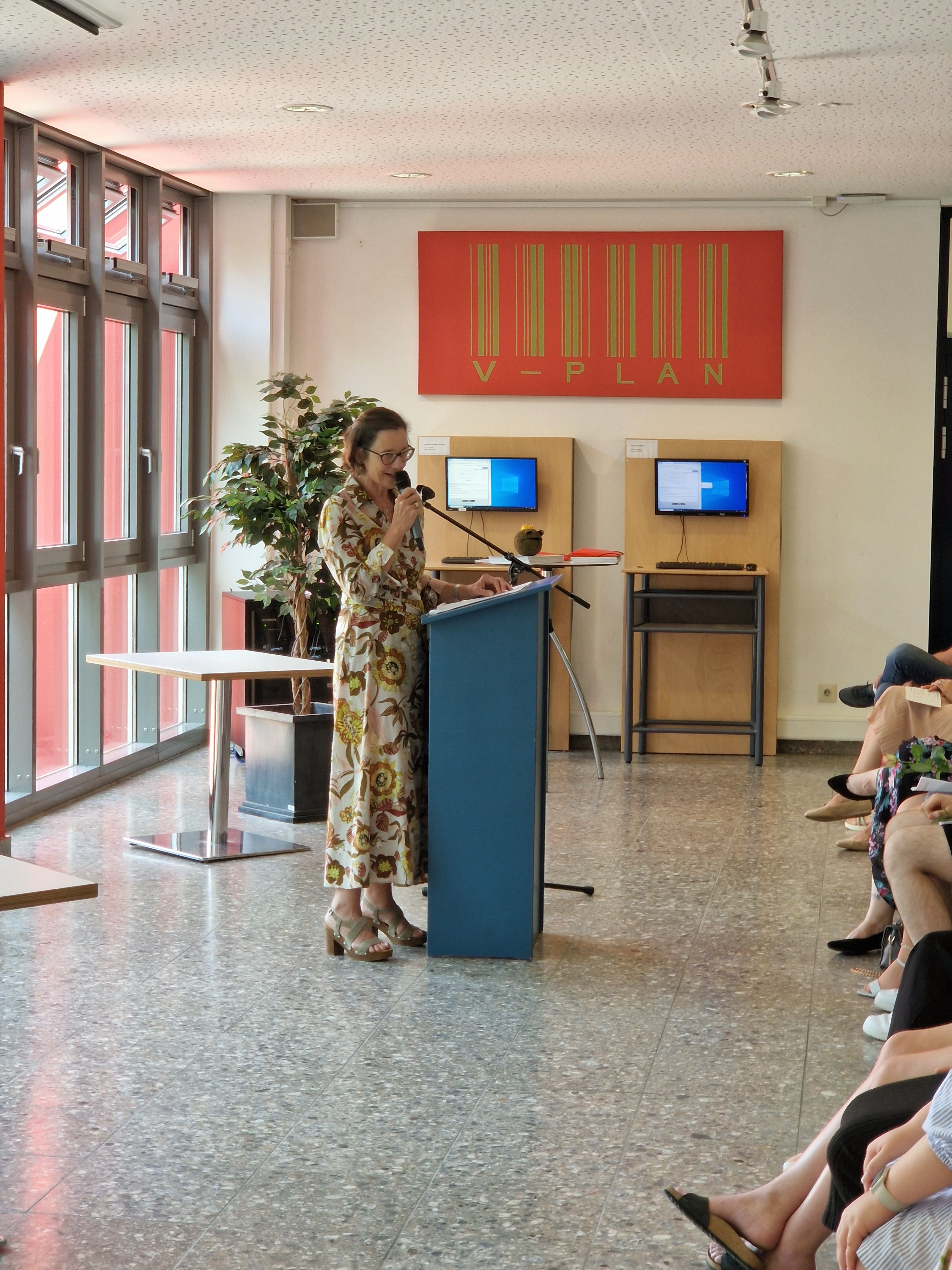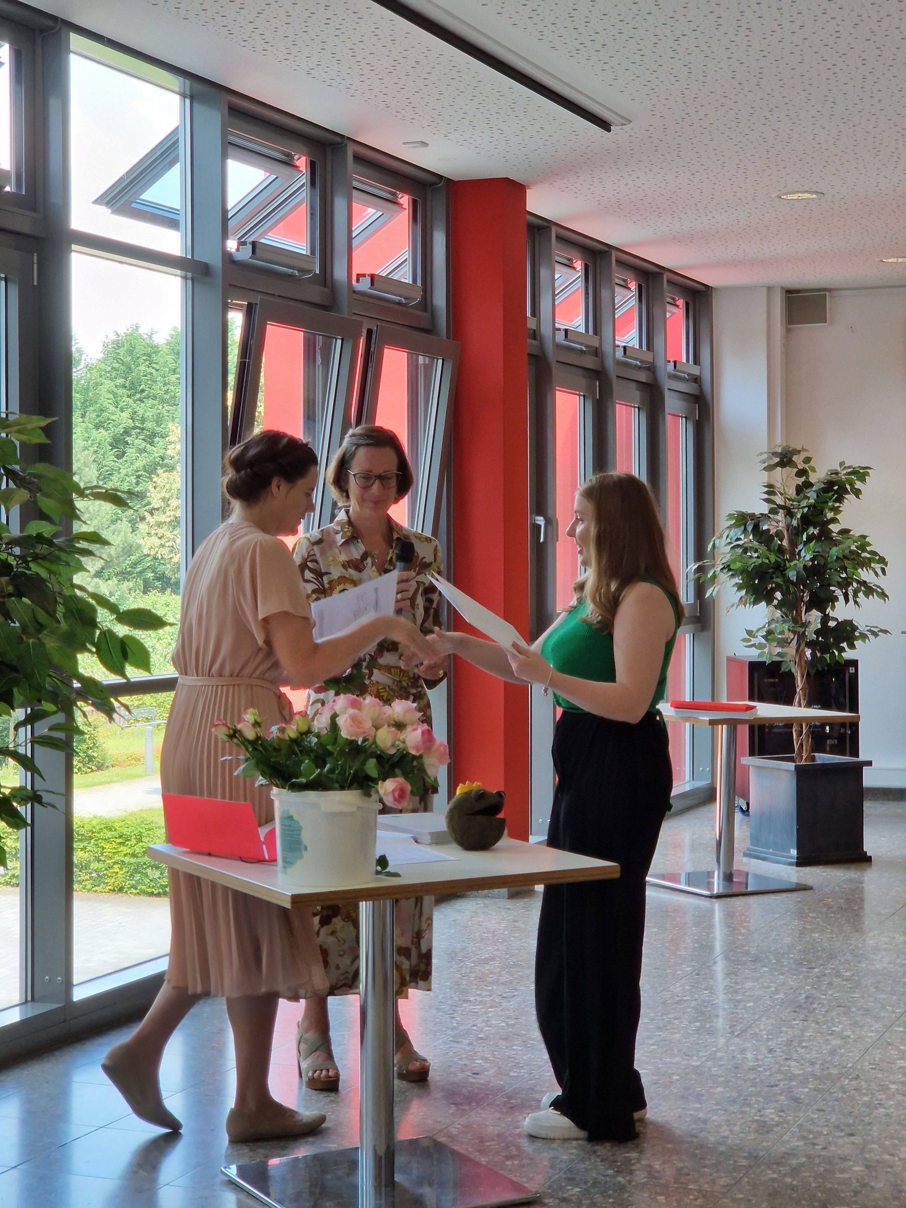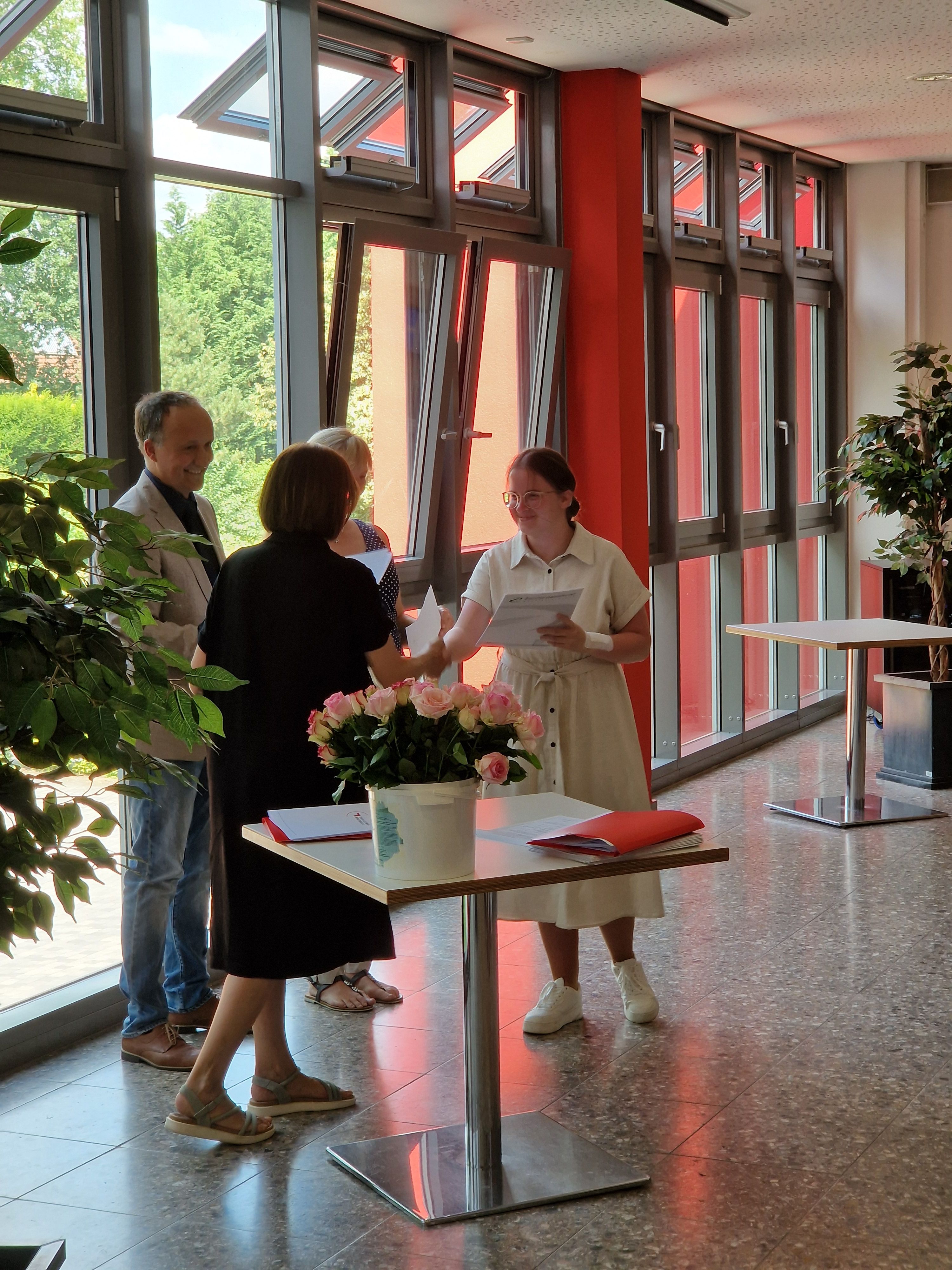 Die Klassenleitungen Frau Holtgrefe, Frau Wamser, Frau Mersch und Herr Schindéle verliehen die Zeugnisse. Frau Holtgrefe führte als Leiterin des Bildungsgangs durch die Verabschiedung und Herr Schindéle hielt eine amüsante, kurzweilige Rede.