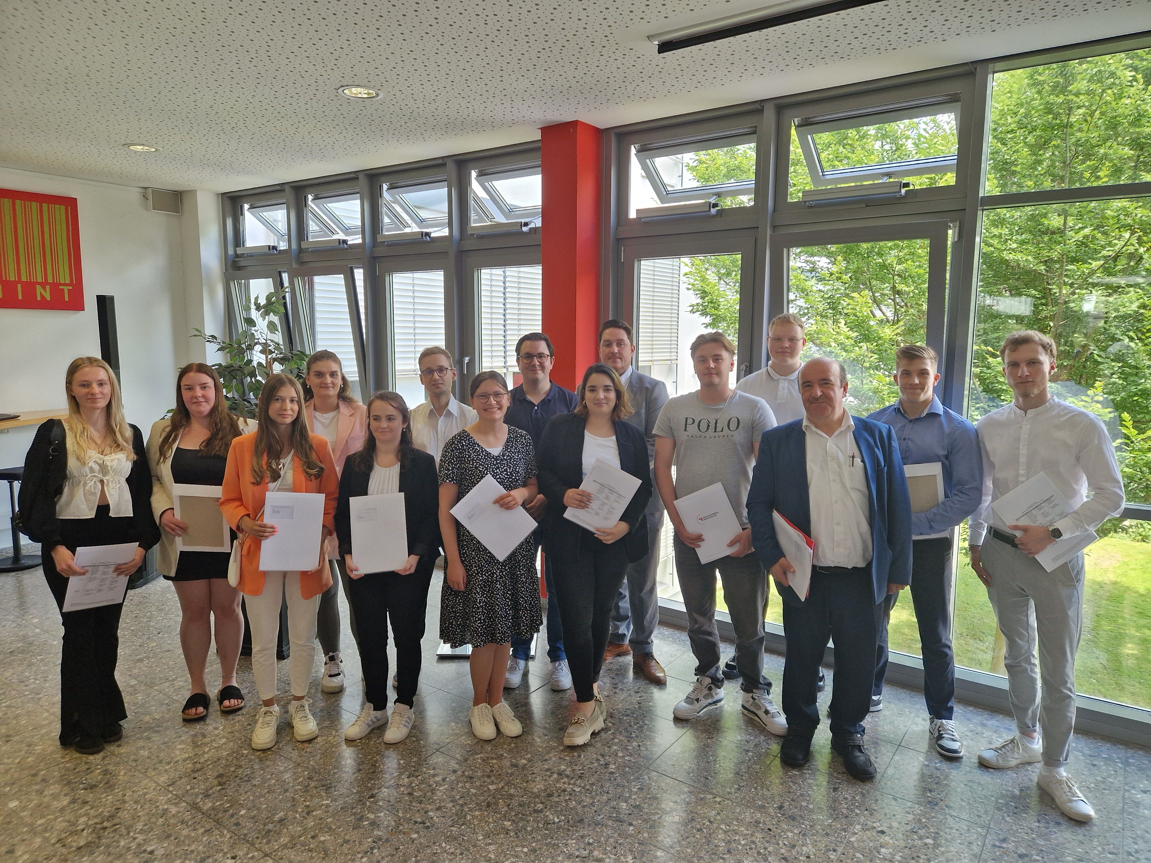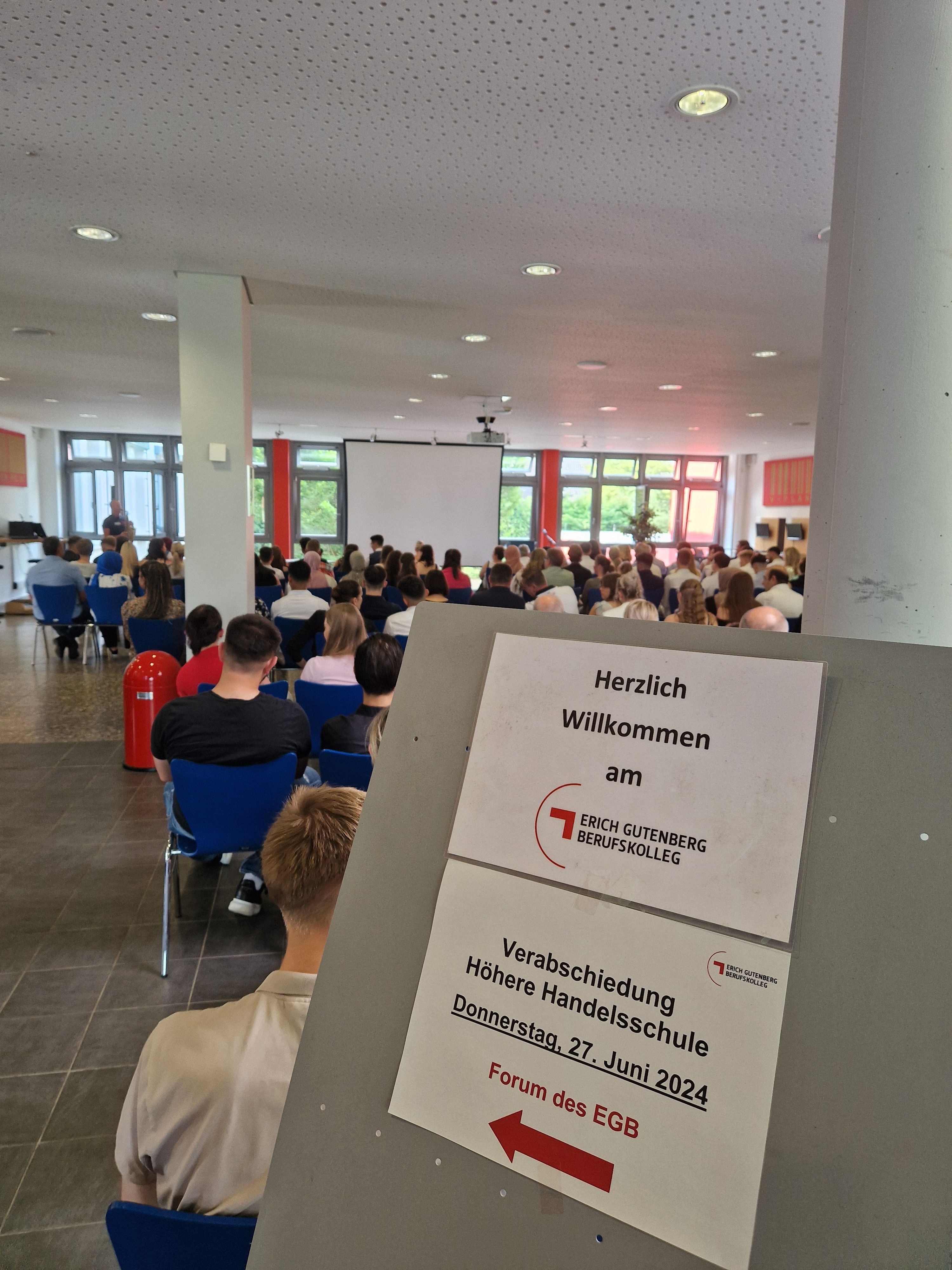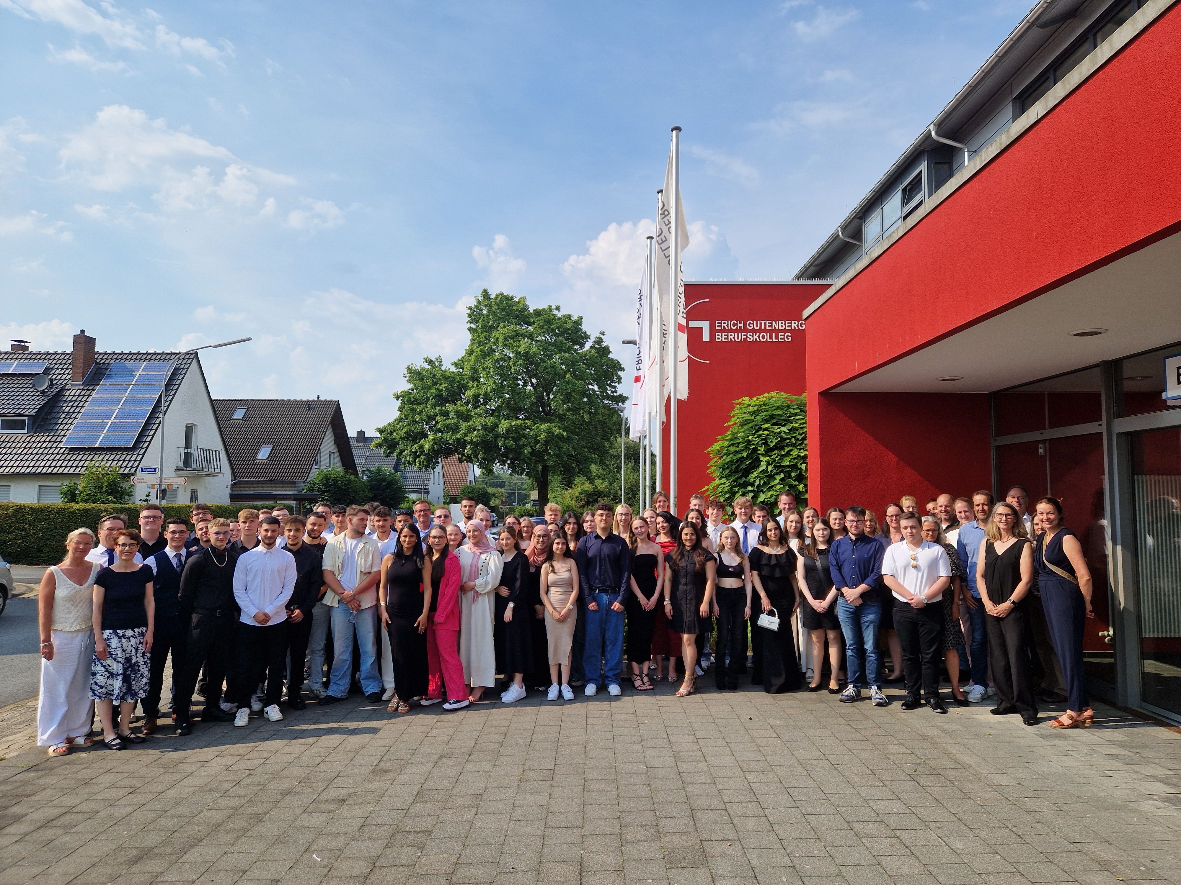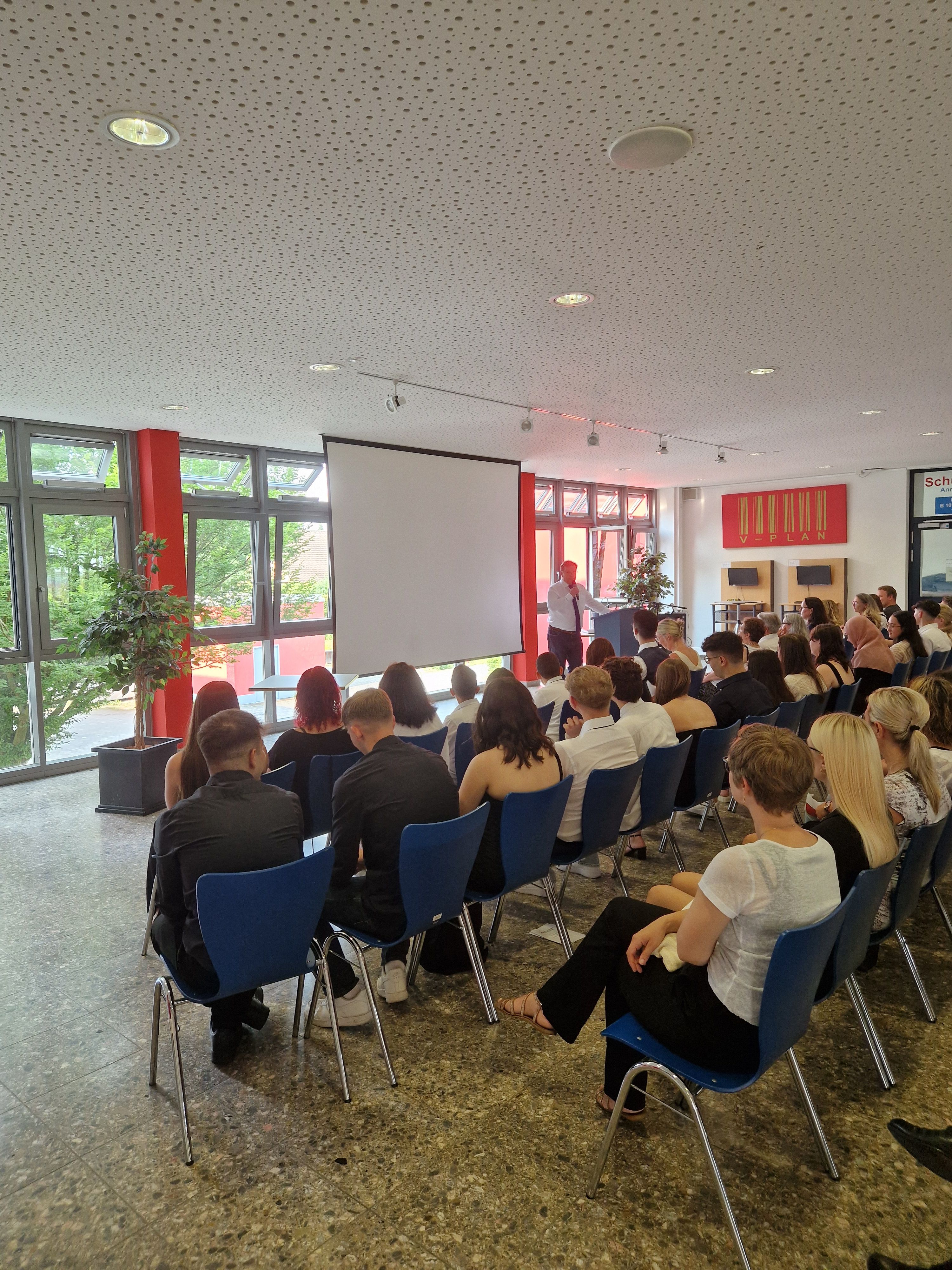 Am Freitag, dem 28.06.2024, wurden insgesamt 176 erfolgreichen Absolventinnen und Absolventen der Ausbildungsberufe Automobilkaufmann/frau, Kaufmann/frau für Büromanagement, Kaufmann/Kauffrau im Einzelhandel, Verkäuferinnen und Verkäufer, Kaufmann/frau im Groß- und Außenhandel, Industriekaufmann/frau, Steuerfachangestellte/r und Verwaltungsfachangestellte/r in feierlichem Rahmen ihre Berufsschulabschlusszeugnisse ausgehändigt.