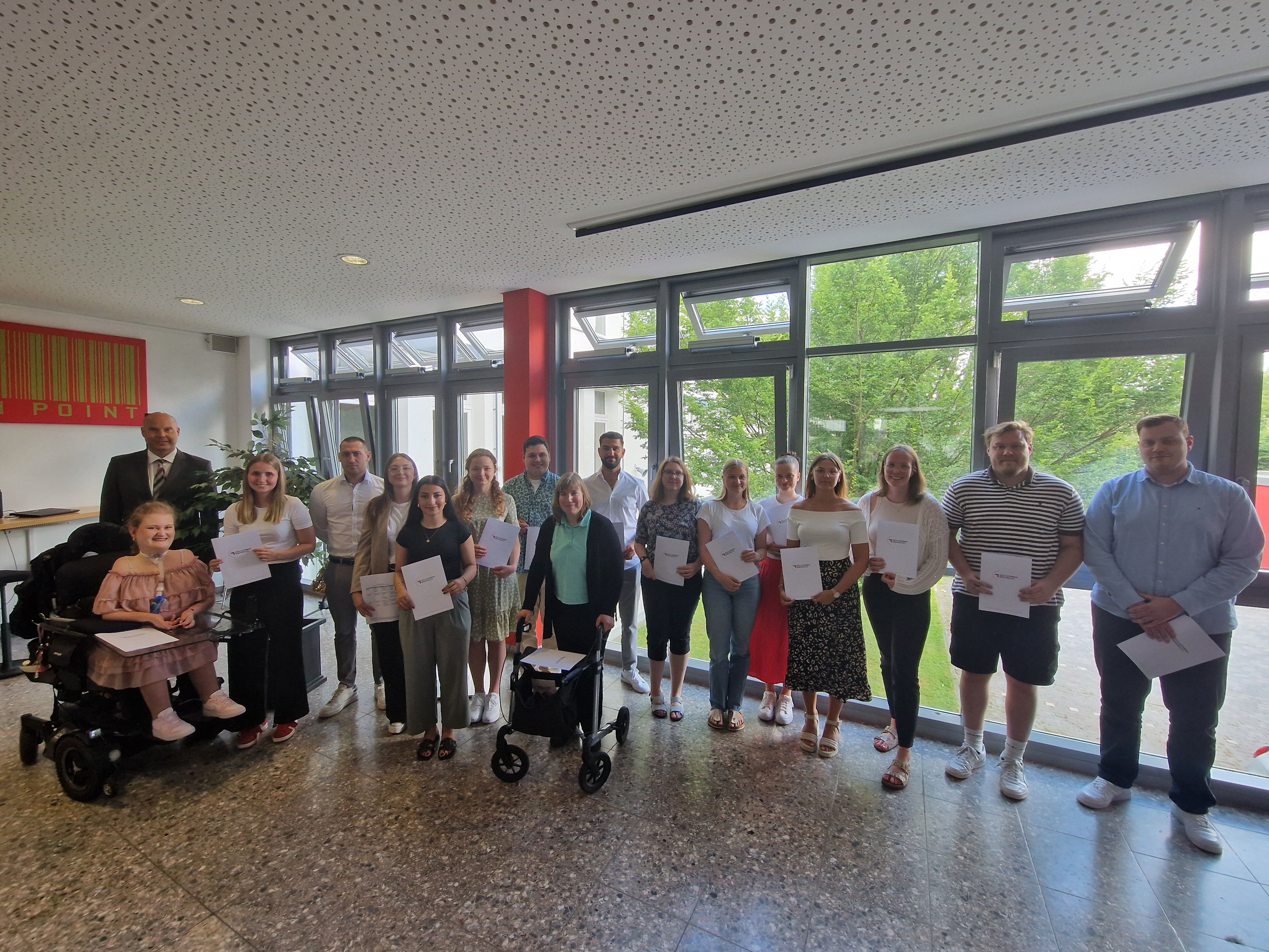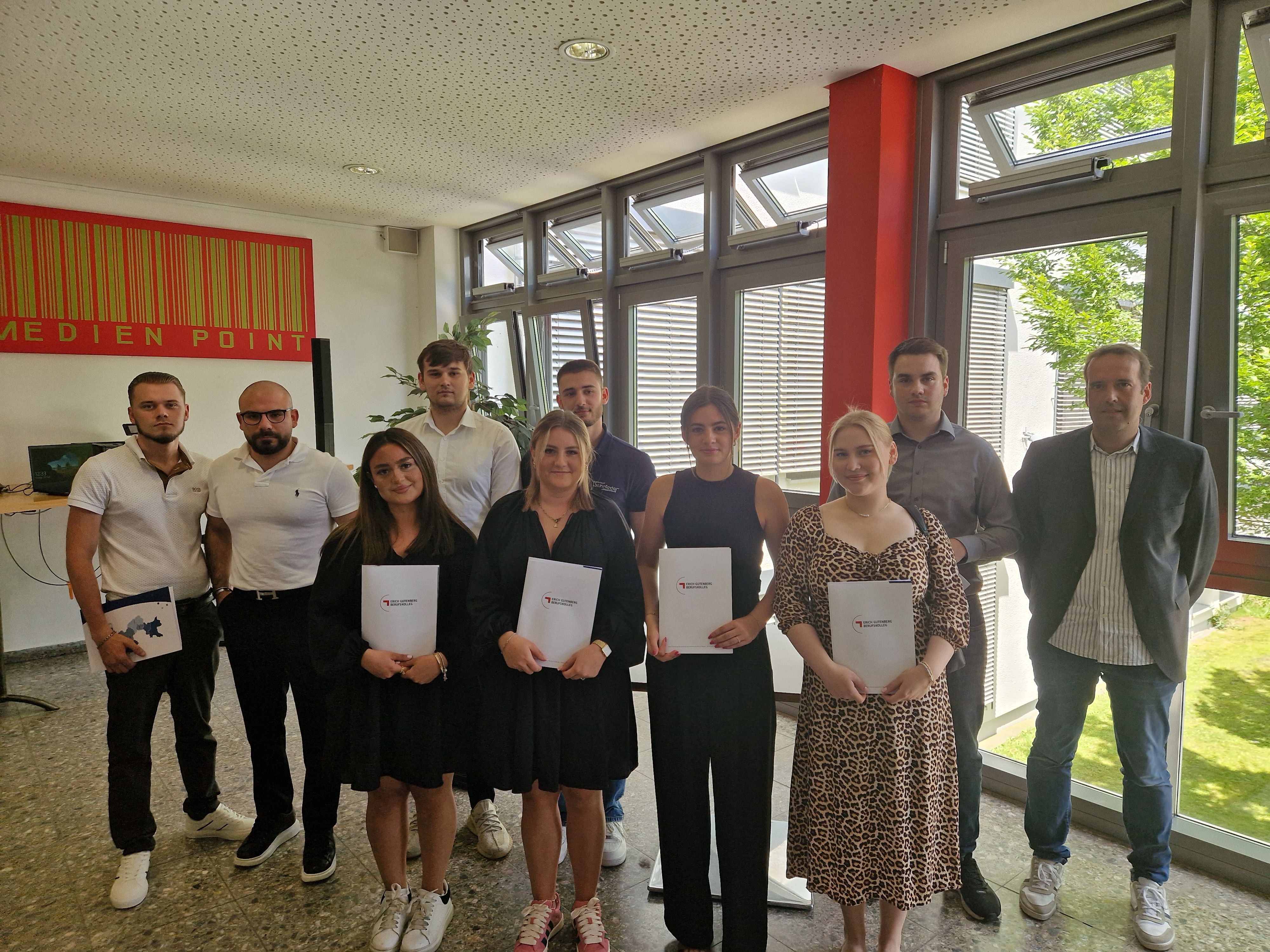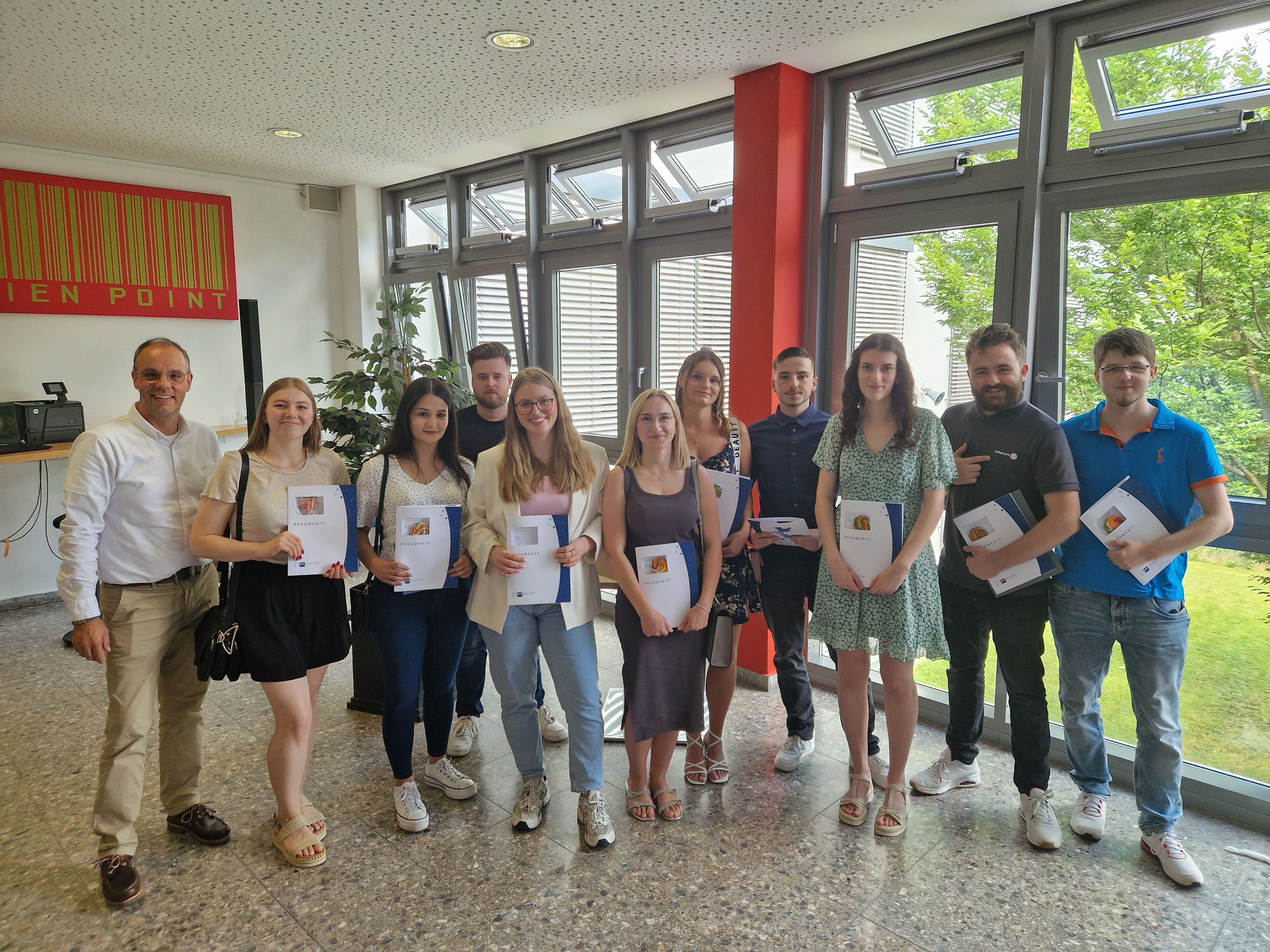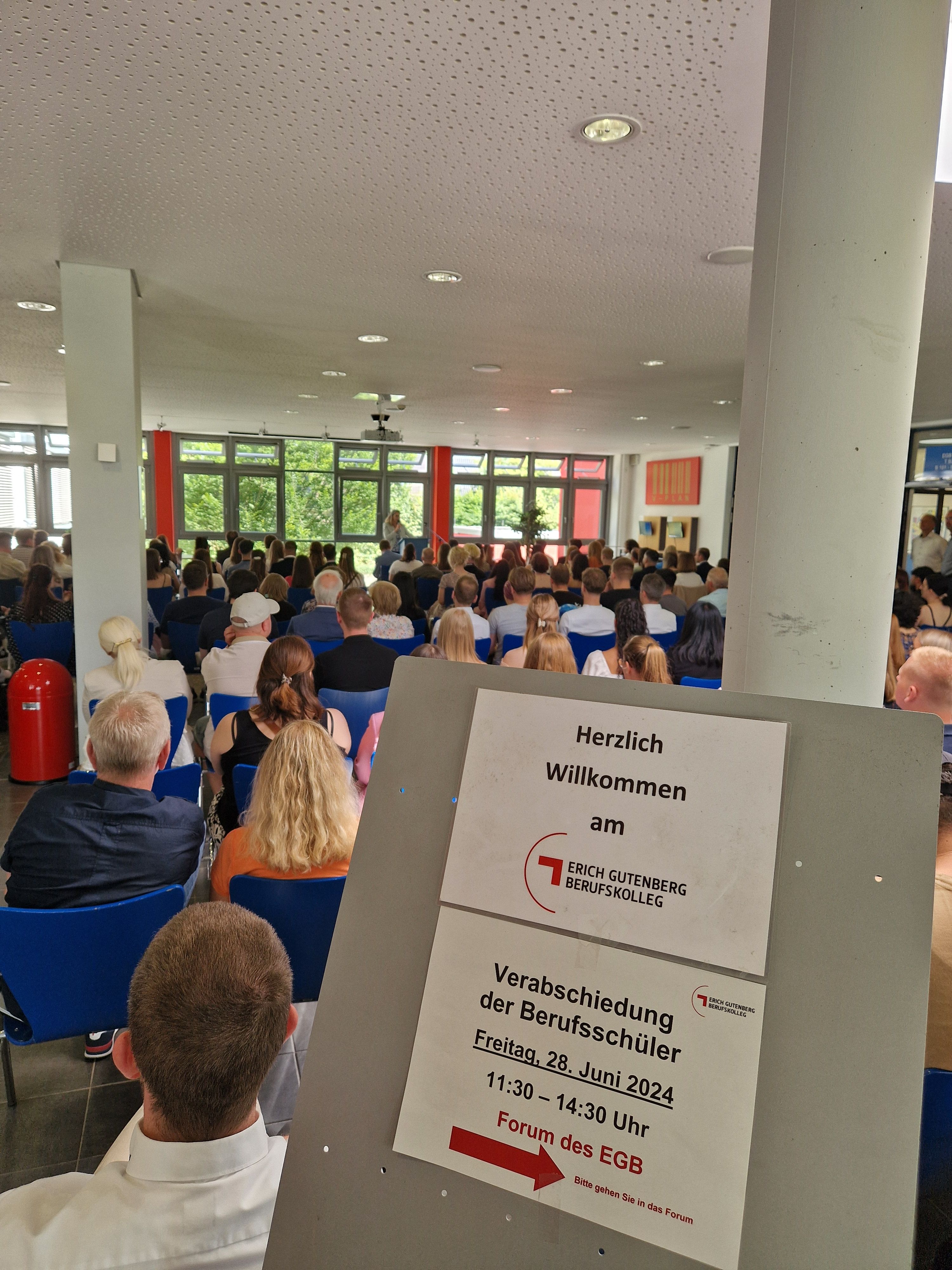 Am Freitag, dem 28.06.2024, wurden insgesamt 176 erfolgreichen Absolventinnen und Absolventen der Ausbildungsberufe Automobilkaufmann/frau, Kaufmann/frau für Büromanagement, Kaufmann/Kauffrau im Einzelhandel, Verkäuferinnen und Verkäufer, Kaufmann/frau im Groß- und Außenhandel, Industriekaufmann/frau, Steuerfachangestellte/r und Verwaltungsfachangestellte/r in feierlichem Rahmen ihre Berufsschulabschlusszeugnisse ausgehändigt.