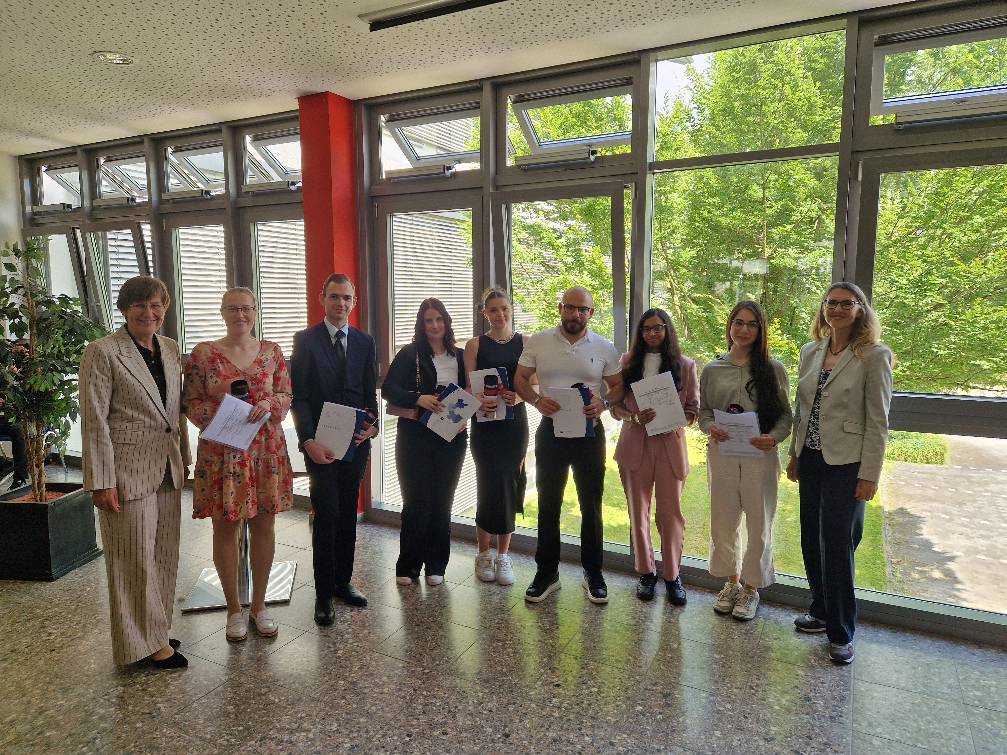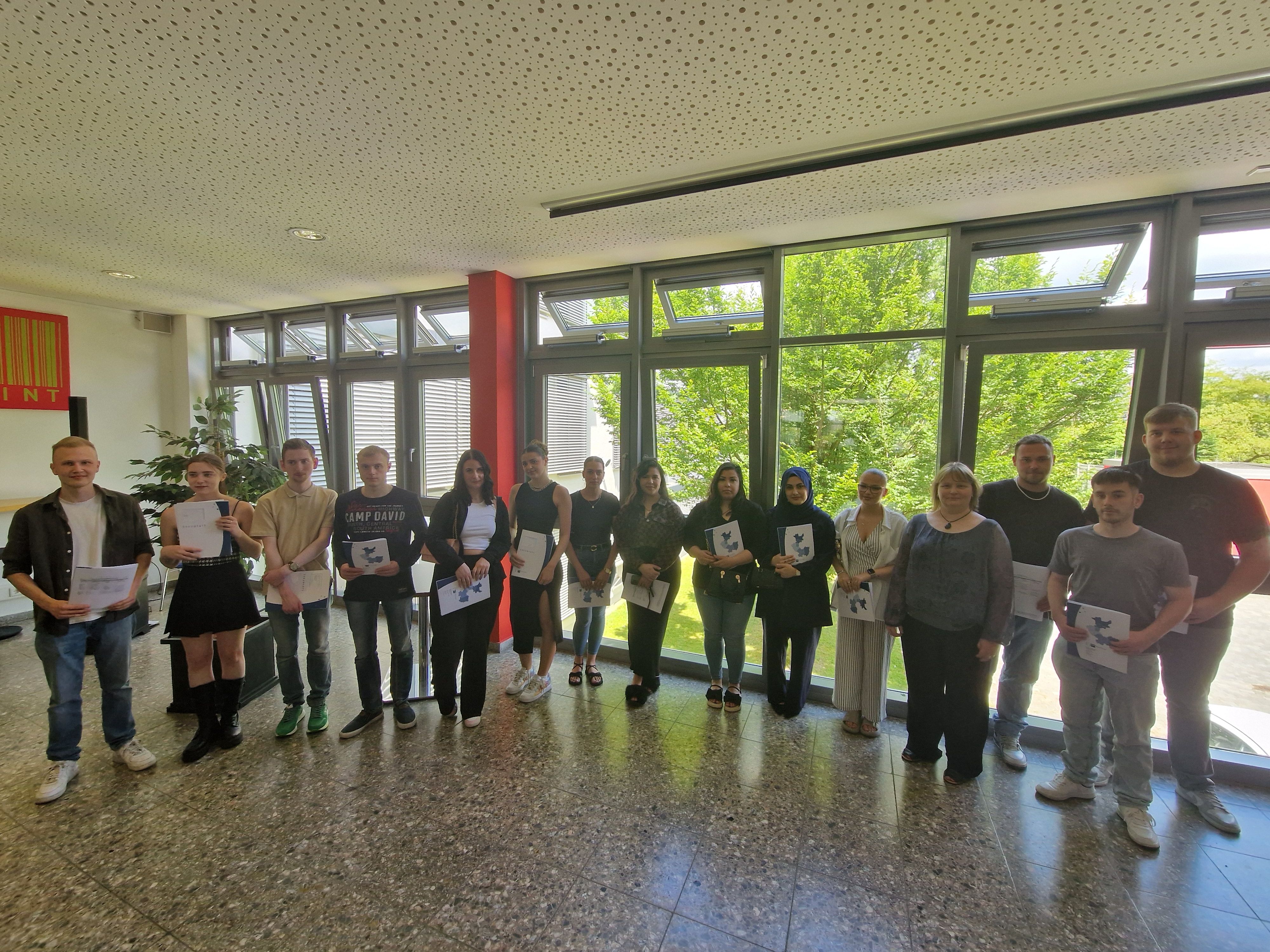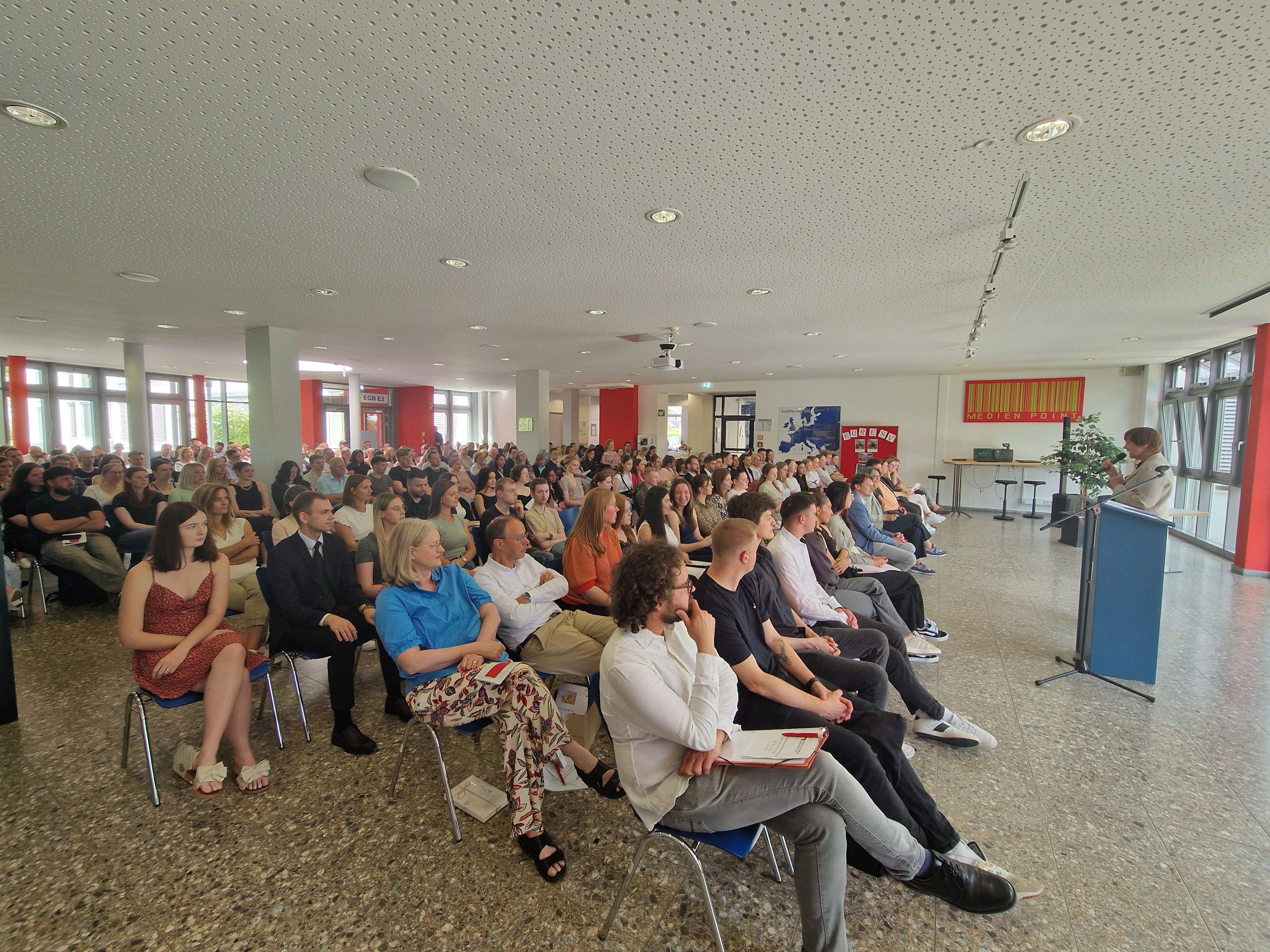 In feierlichem Rahmen, mit Redebeiträgen von Schülern und Abteilungsleitung, einem Lehrerquiz und Ehrungen für die Jahrgangsbesten erhielten die Absolventinnen und Absolventen ihre Zeugnisse zum Erweiterten Ersten Schulabschluss (HS 10) bzw. zum Mittleren Schulabschluss (FOR). Die Jahrgangsbesten waren: Thore Boesch, Mykyta Siniuchkov, Kirian Macke, Leonie Saschinsky, Jakub Hreno und Larissa Müller.