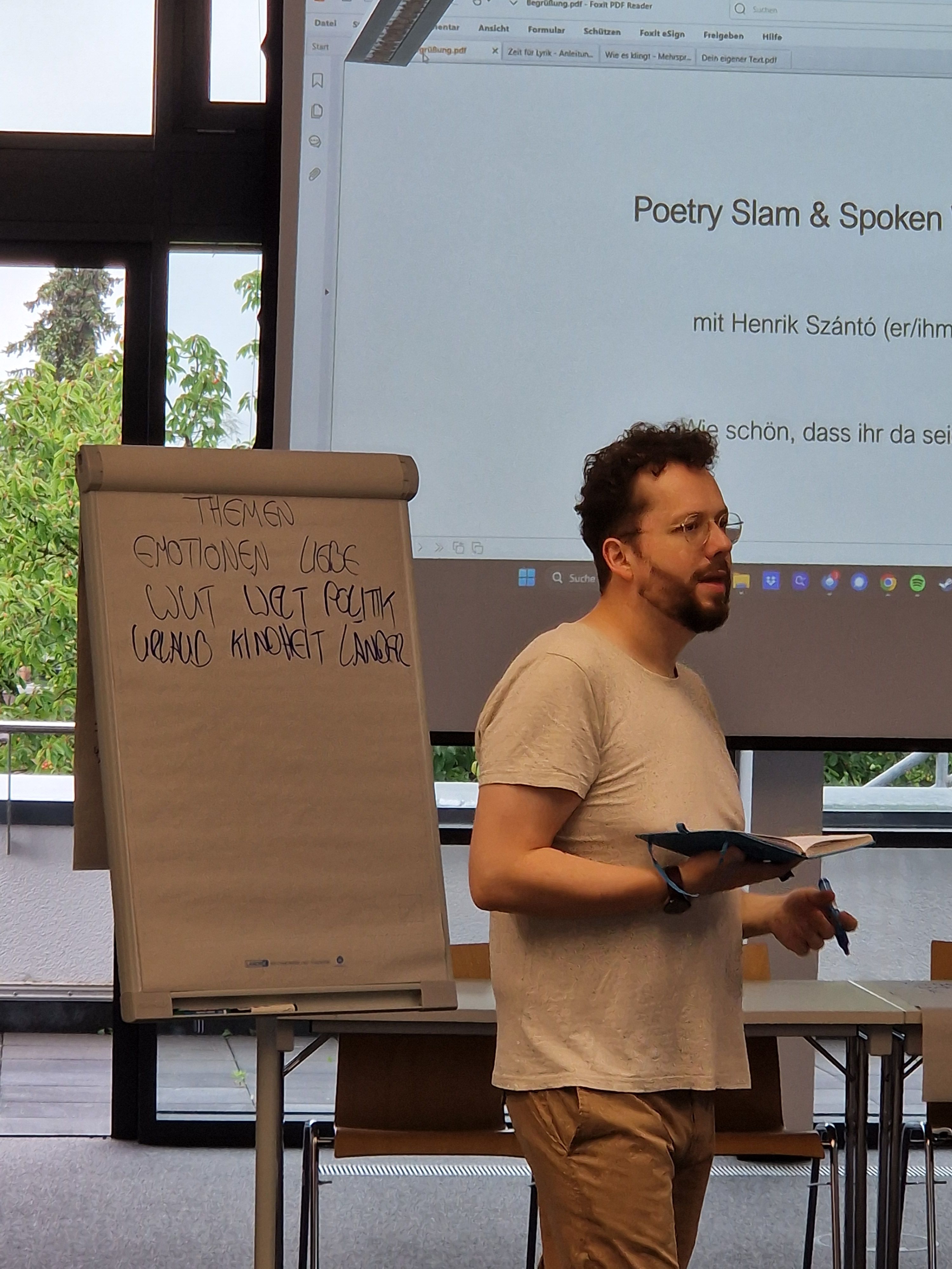 Am 29.05.2024 durften wir Henrik Szanto erneut bei uns im EGB begrüßen und mit ihm gemeinsam einen Poetry-Slam-Workshop, der von der Sparkasse Herford finanziert wurde, anbieten. Mit viel Freude und Kreativität haben in diesem Jahr Schülerinnen und Schüler unserer Unterstufenklassen der Höheren Handelsschule teilgenommen.