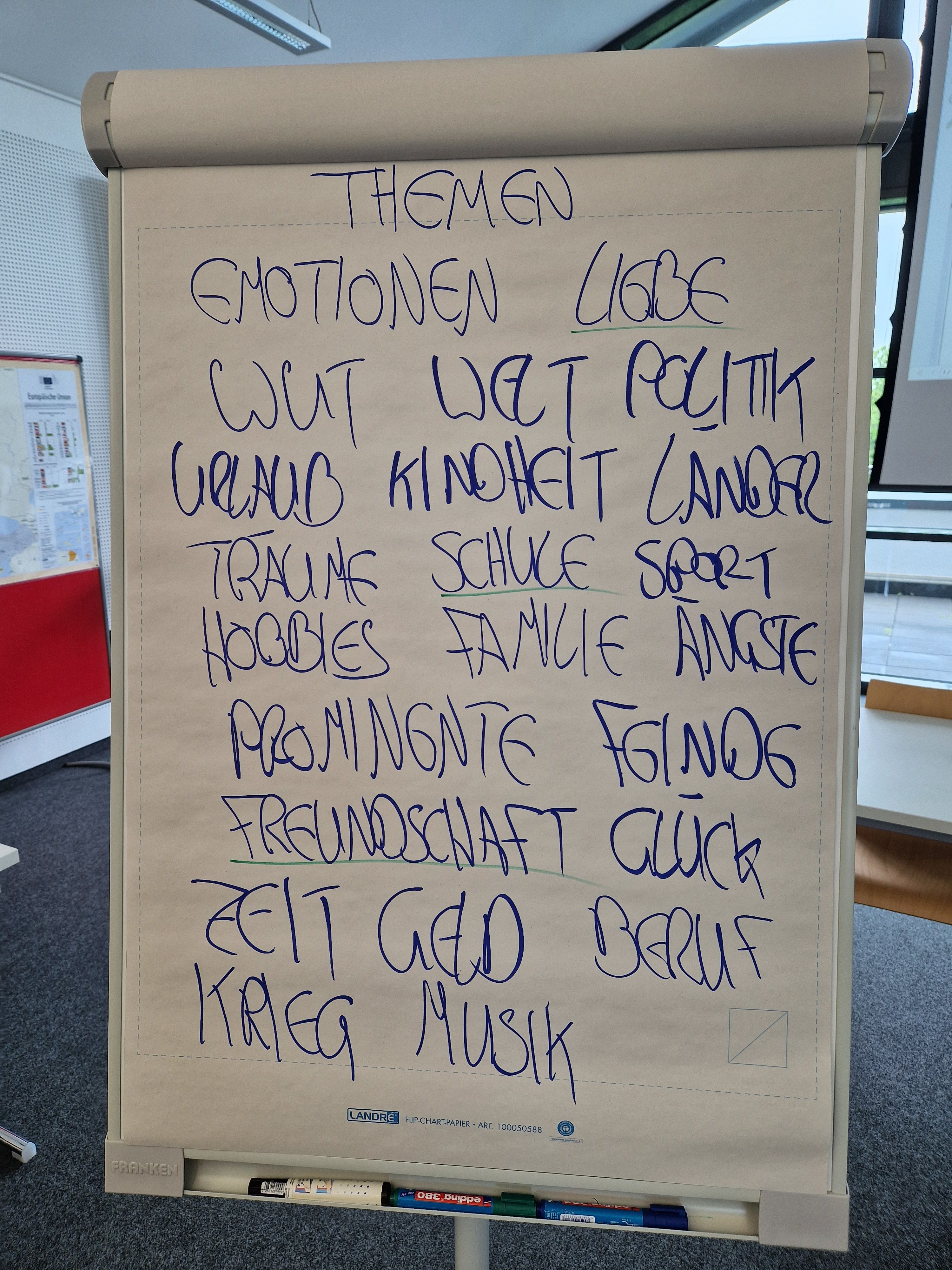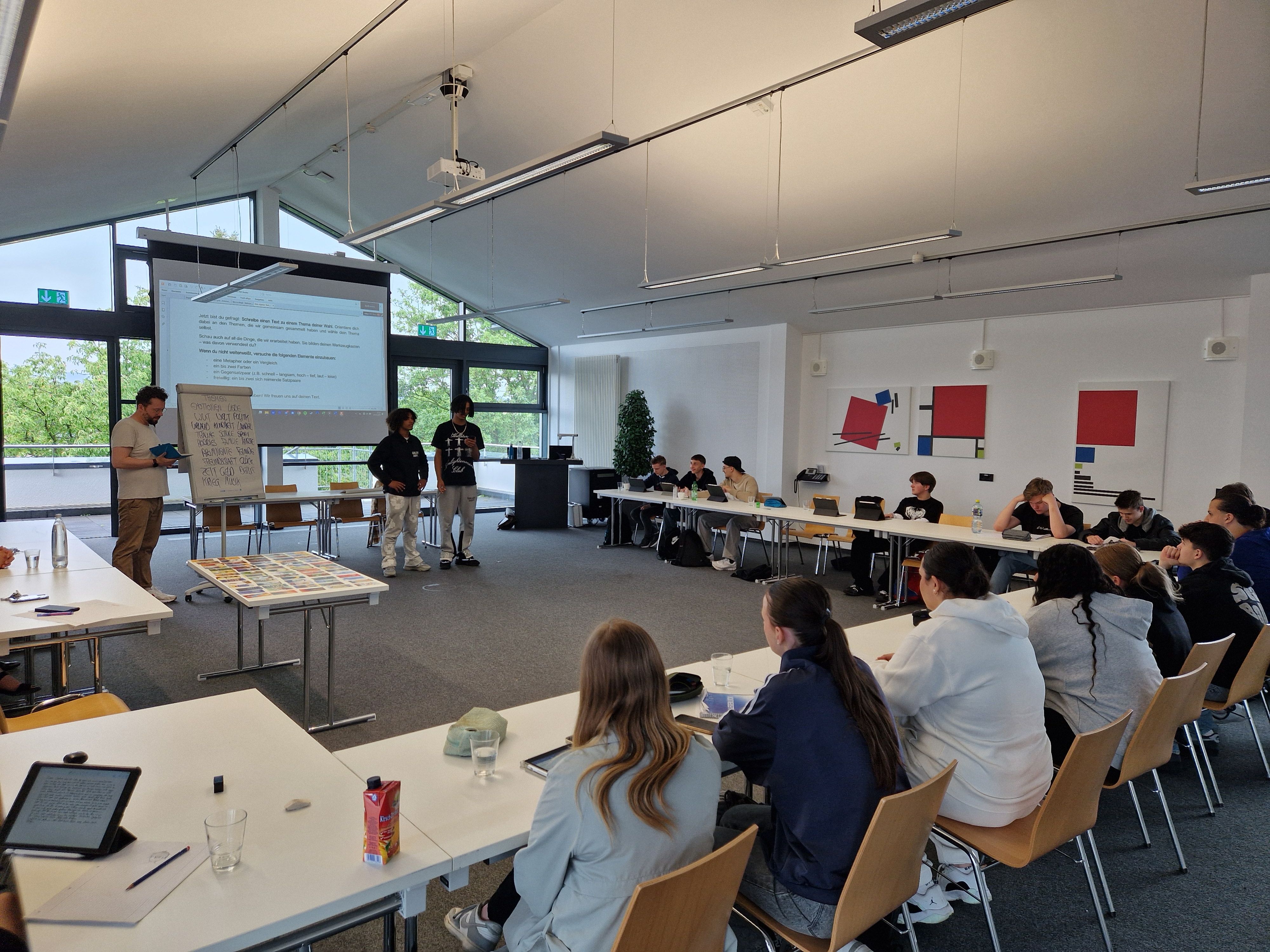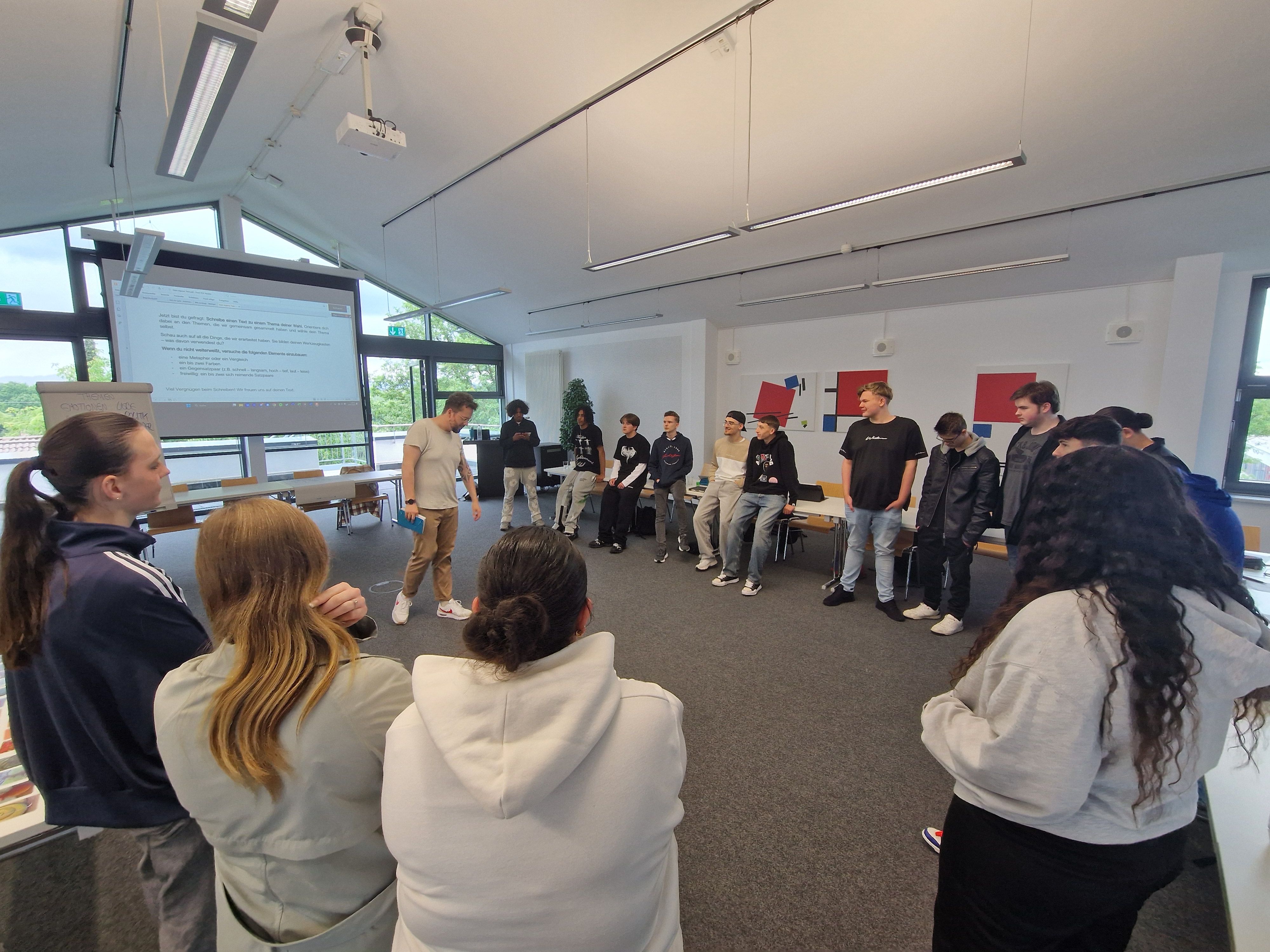 Nach kleineren Anfangsübungen zur Steigerung von Mut und Lockerheit sowie der gemeinsamen Erarbeitung einer „Toolbox“ arbeiteten unsere Schüler an ihren ersten, eigenen Texten, die sie anschließend auf der „Bühne“ performten. Die Themen fokussierten sich beispielsweise auf das Leben, Sport, Politik, Gesellschaft, Sprache und das gemeinsame Miteinander.