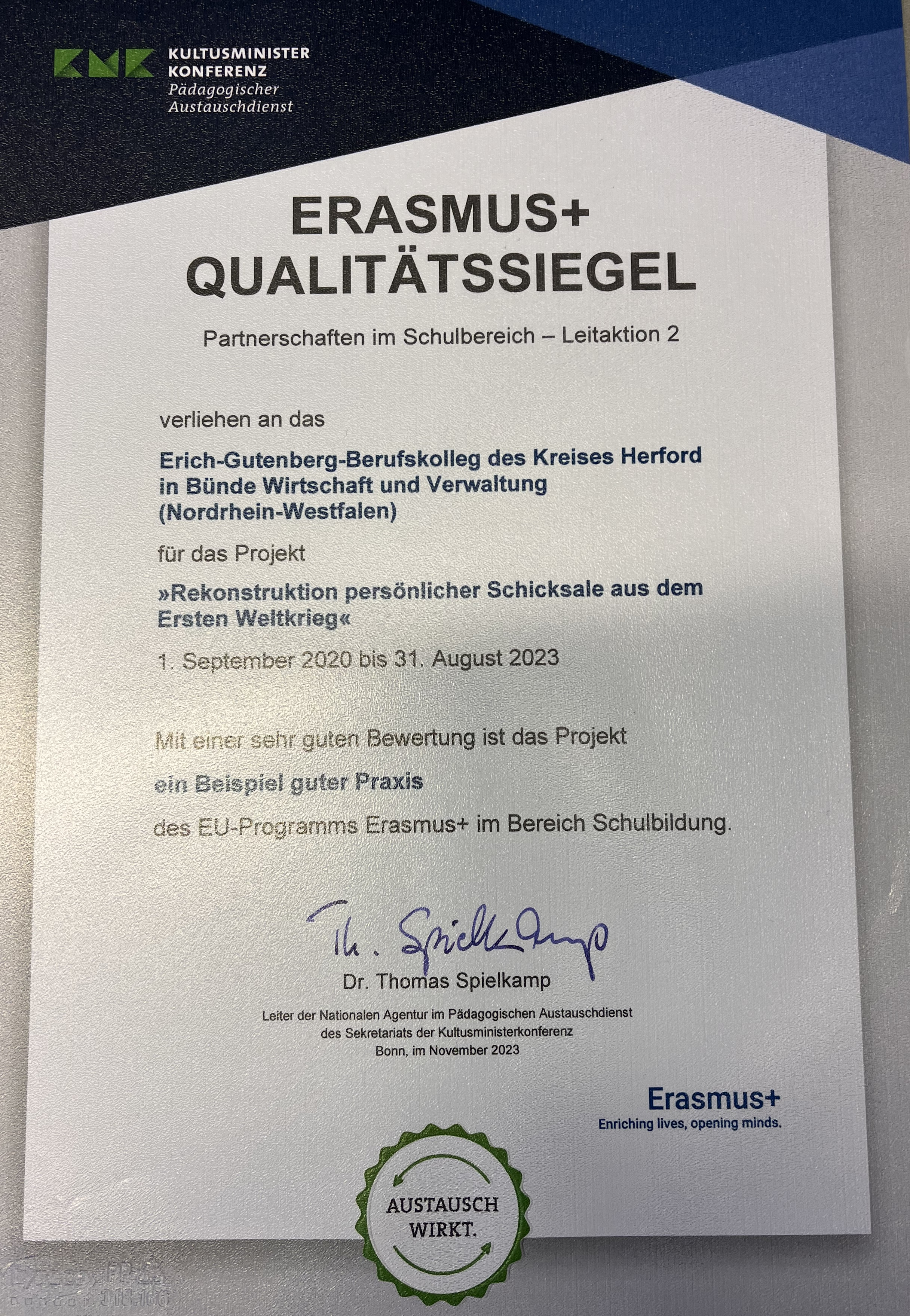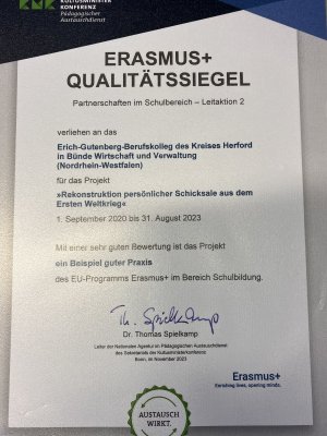 Schulministerin Dorothee Feller richtete sich im April 2024 persönlich an unsere Schulleitung. Sie freue sich sehr, das Erich-Gutenberg-Berufskolleg Bünde für das Erasmus+ Projekt "Rekonstruktion persönlicher Schicksale aus dem Ersten Weltkrieg" auszeichnen zu können. Besonderen Dank und besonderes Lob spricht sie allen beteiligten Schülerinnen und Schülern sowie Lehrkräften aus.